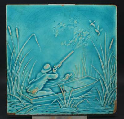 ANTIQUE MINTON HOLLINS AQUA BLUE DUCK HUNTER SCENE 8" x 8" CERAMIC TILE