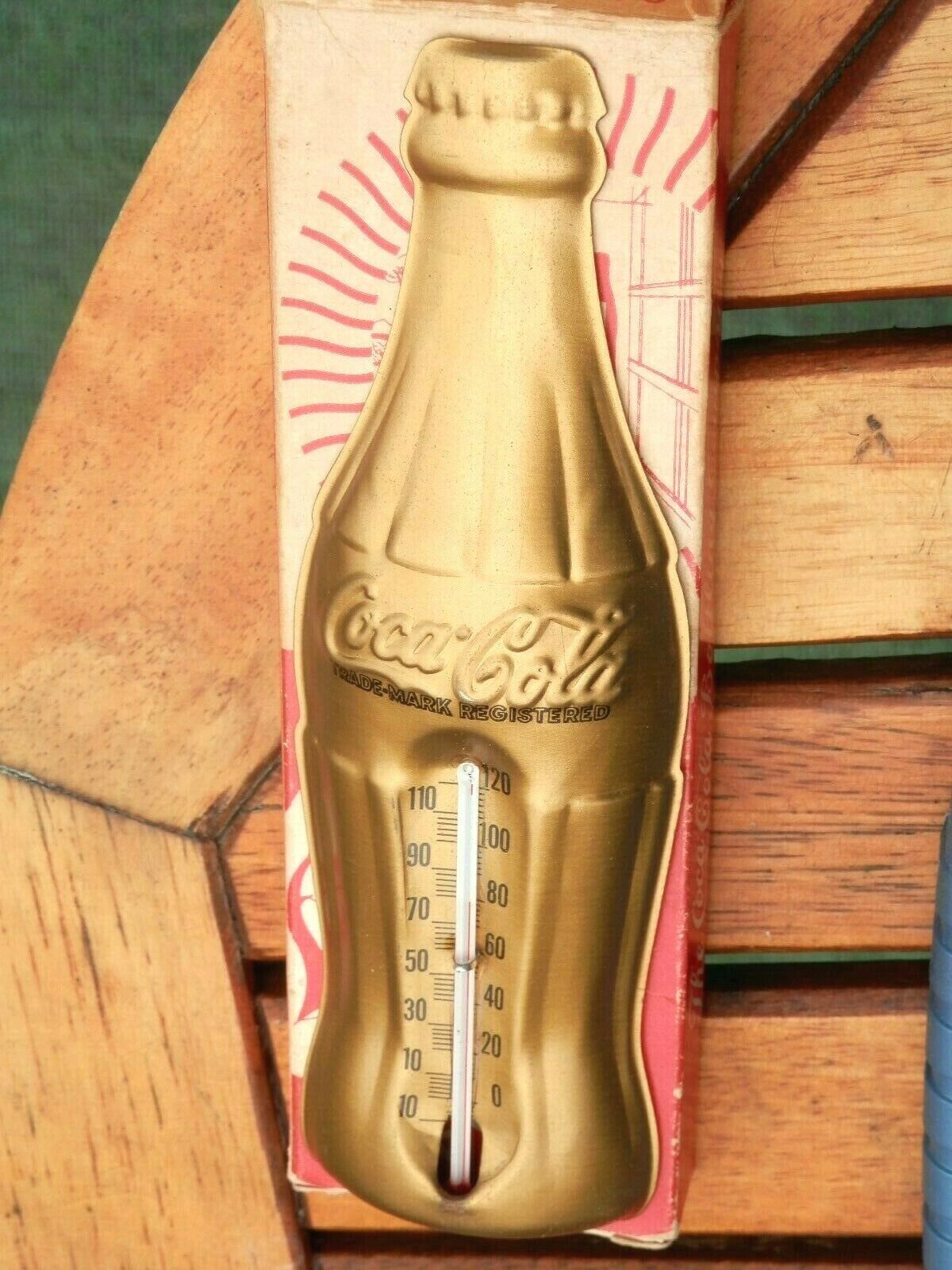 Title (ebay affiliate link): Vintage NOS IN BOX 1950`s Gold Coca-Cola Bottle Advertising Tin Thermometer 7"