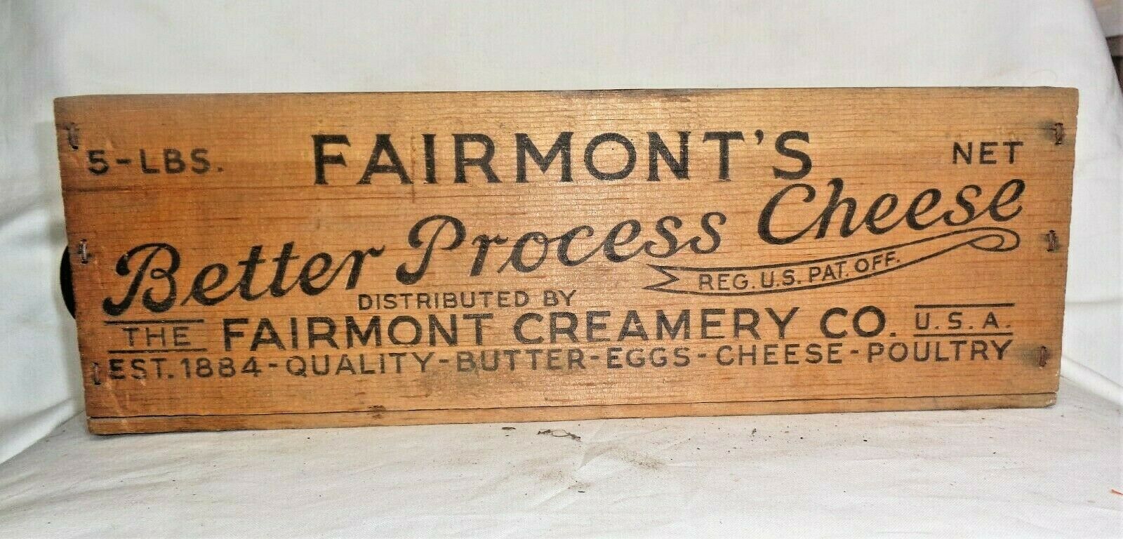 Antique Vintage FAIRMONT''S Wood Wooden Advertising Cheese Crate Box 5 Lbs
