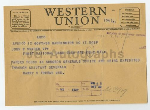 Title (ebay affiliate link): Harry S. Truman 1944 Telegram Sent to Future Secretary of Treas. John Snyder