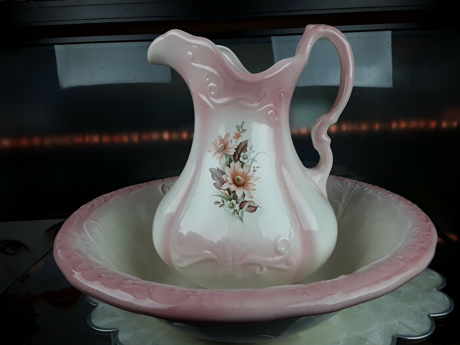 Title (ebay affiliate link): Vintage Large Water Wash Basin Set Pitcher & Bowl White Pink Flowers R S Prussia