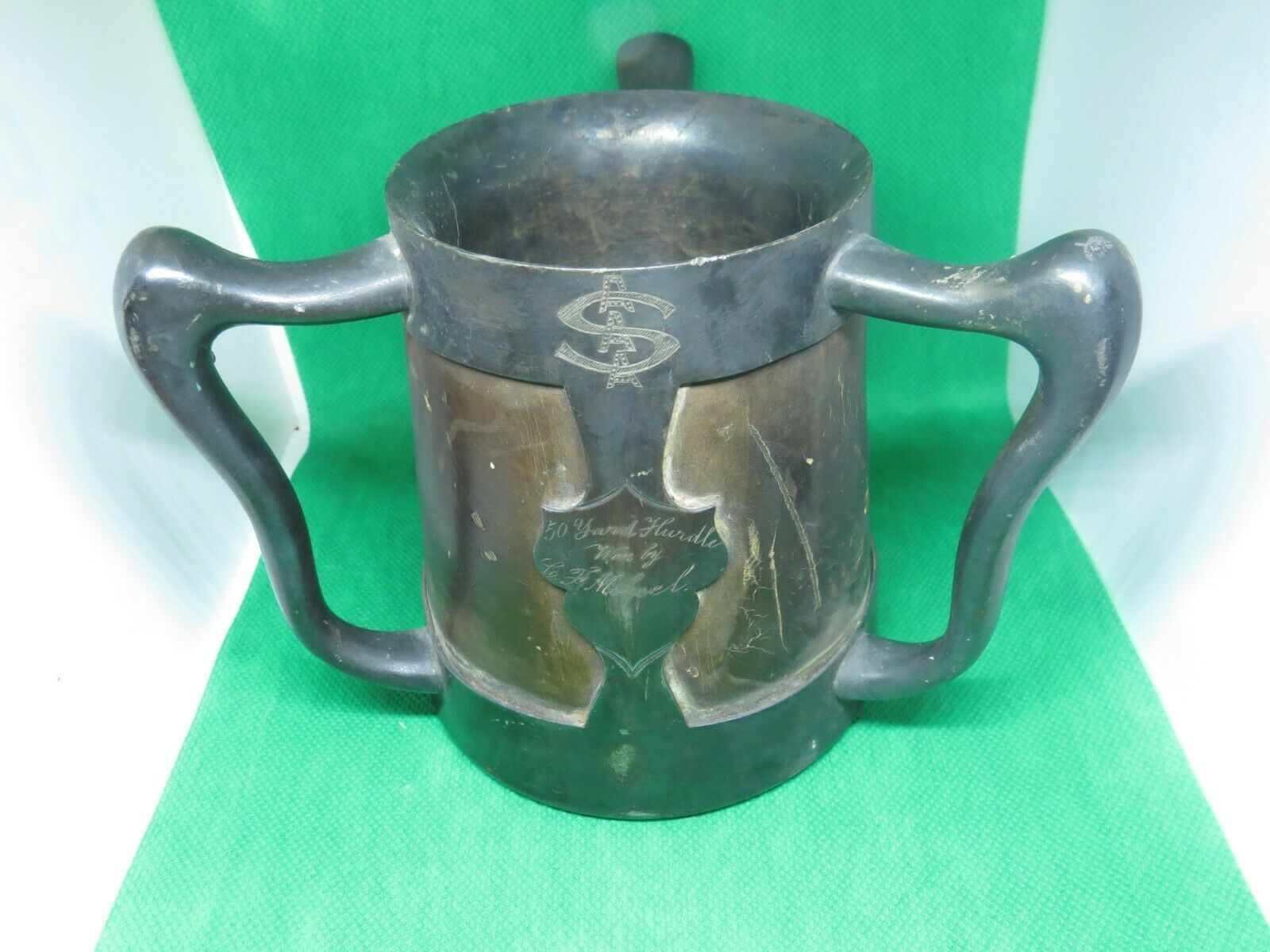 Rare Antique 3 Handle Pewter Leather Wrapped Trophy Stein Tankard CS