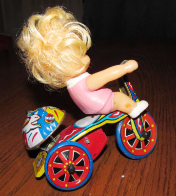 Antique Tin Litho Wind-up Bike with Doll Rider - JAPAN