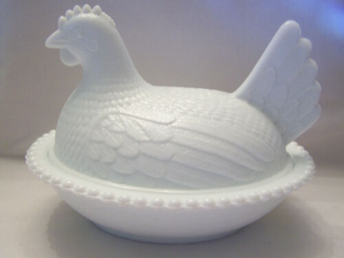 Title (ebay affiliate link): VINTAGE WHITE MILK GLASS NESTING HEN / CHICKEN 7" CANDY DISH