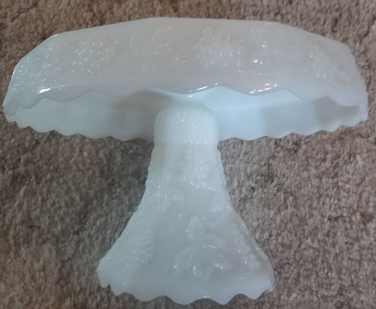 10" Diameter White Milk Glass Cake Serving Dish Stand, 7" Tall Grape Vine Design