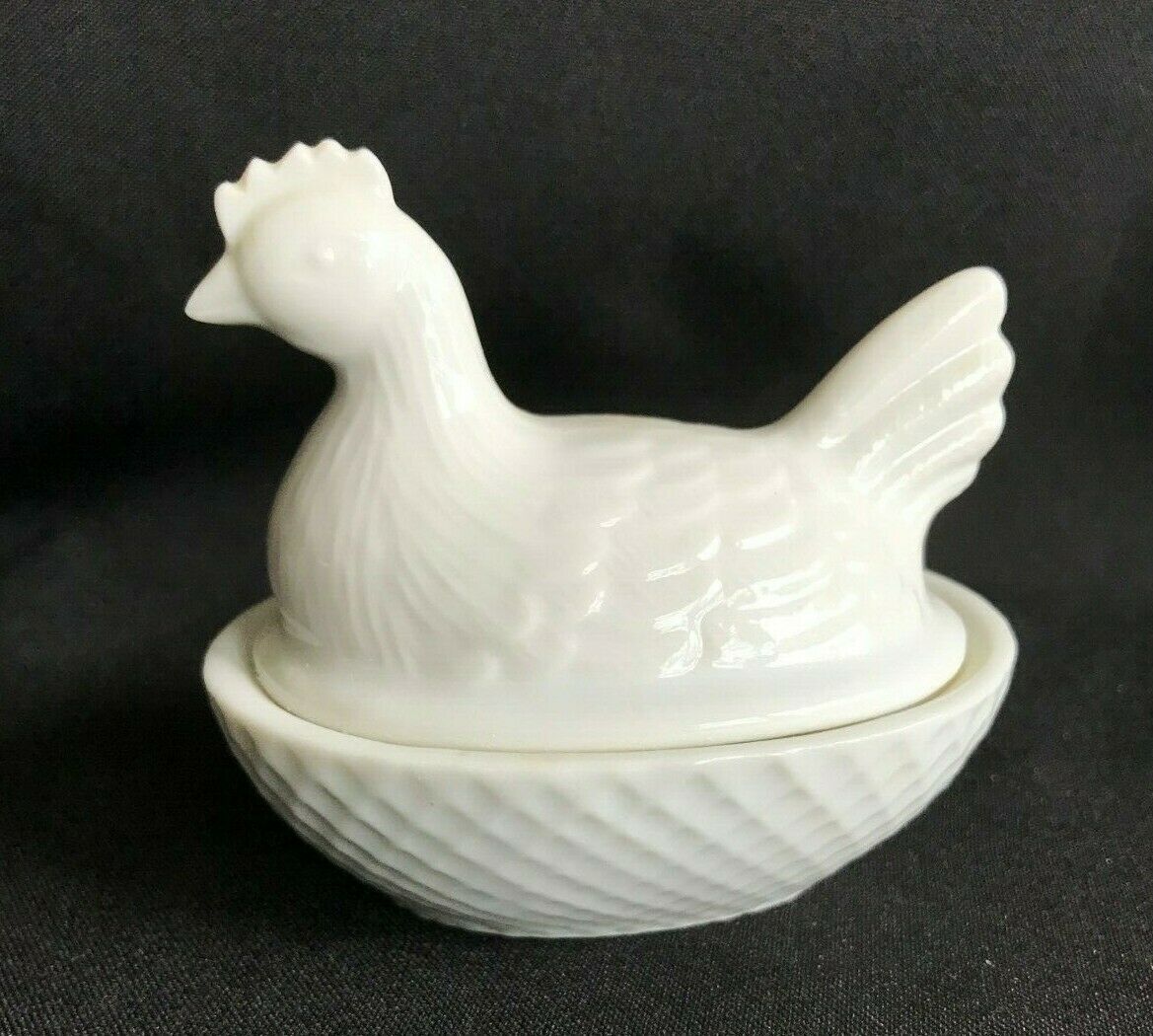 White Milk Glass Chicken Hen On Nest Covered Trinket Dresser Dish Jewelry Holder
