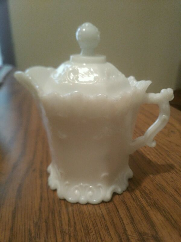 Title (ebay affiliate link): Vintage white milk glass ornate covered Creamer Pitcher Beautiful Beaded