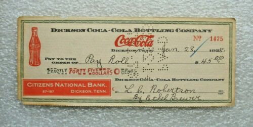 Title (ebay affiliate link): 1929 Dickson Coca-Cola Bottling Plant Dickson TN. Company Pay Roll Check