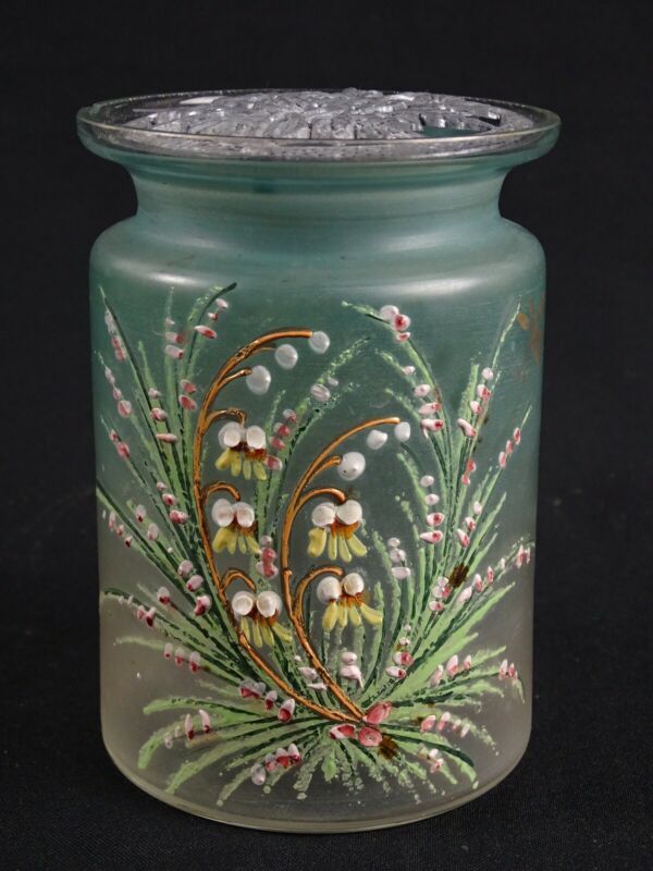 Antique Victorian Vaseline Glass Potpourri Hand Painted Floral Blown Glass