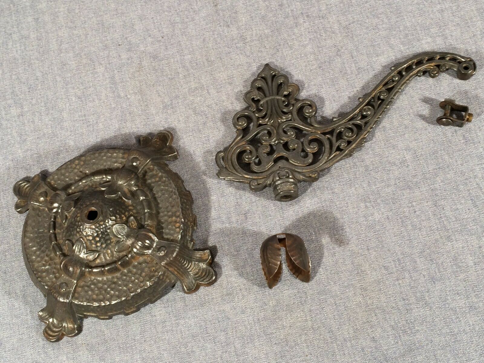 Antique Cast Iron Bridge Lamp Parts Base, Bridge Arm, Hanger, Steel Leaves Used