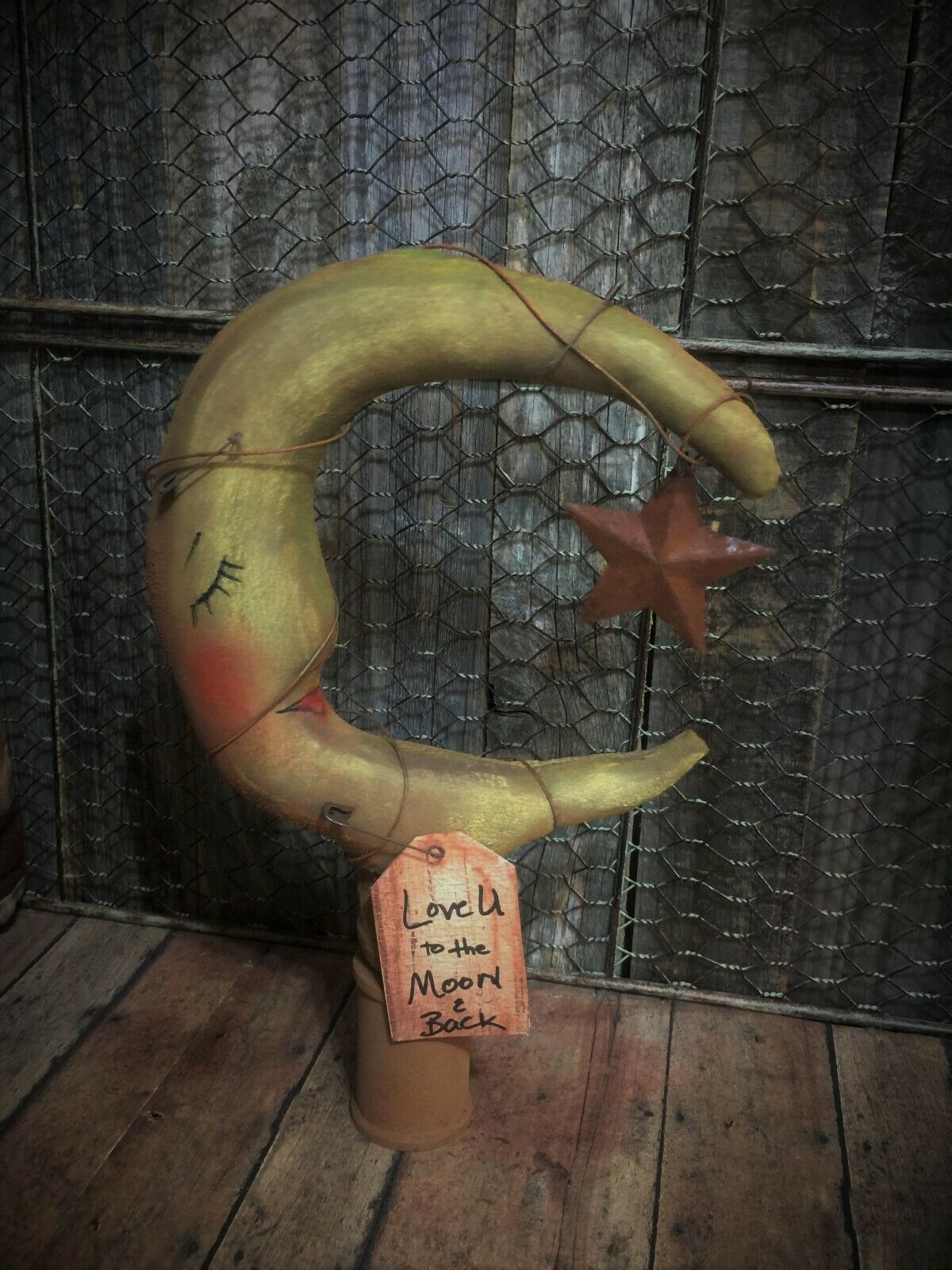 Title (ebay affiliate link): *Primitive 10x7in MOON BOBBIN LOVE U Handmade Fabric Country old rusty doll*