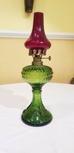 Title (ebay affiliate link): Vintage Embellished Green Glass Paraffin Oil Lamp Lantern & Red Glass Chimney