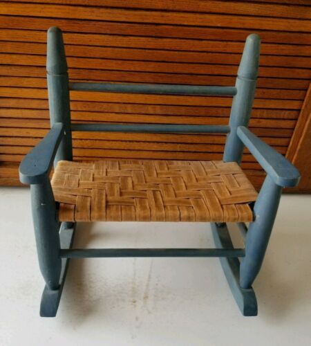 Title (ebay affiliate link): Vintage Primitive Old Blue Wicker Wood Bench Armchair Doll Bear Furniture