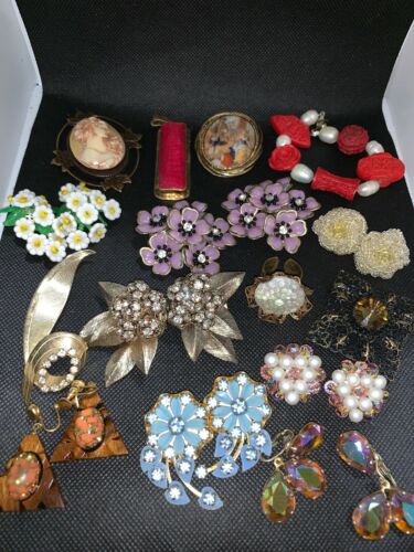Title (ebay affiliate link): Vintage Jewelry Lot Rhinestones AB Beads Milk Glass Cinnabar Pearl Hand Painted
