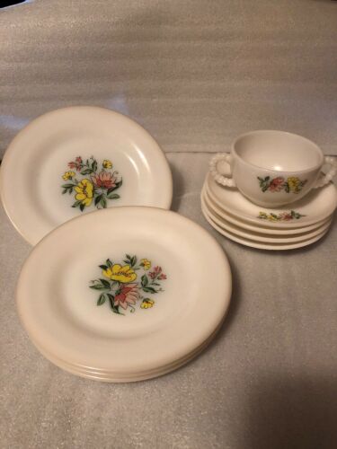 Title (ebay affiliate link): 10 Piece Lot of Milk Glass Hazel Atlas Sugar Cup & Plates With Floral Designs