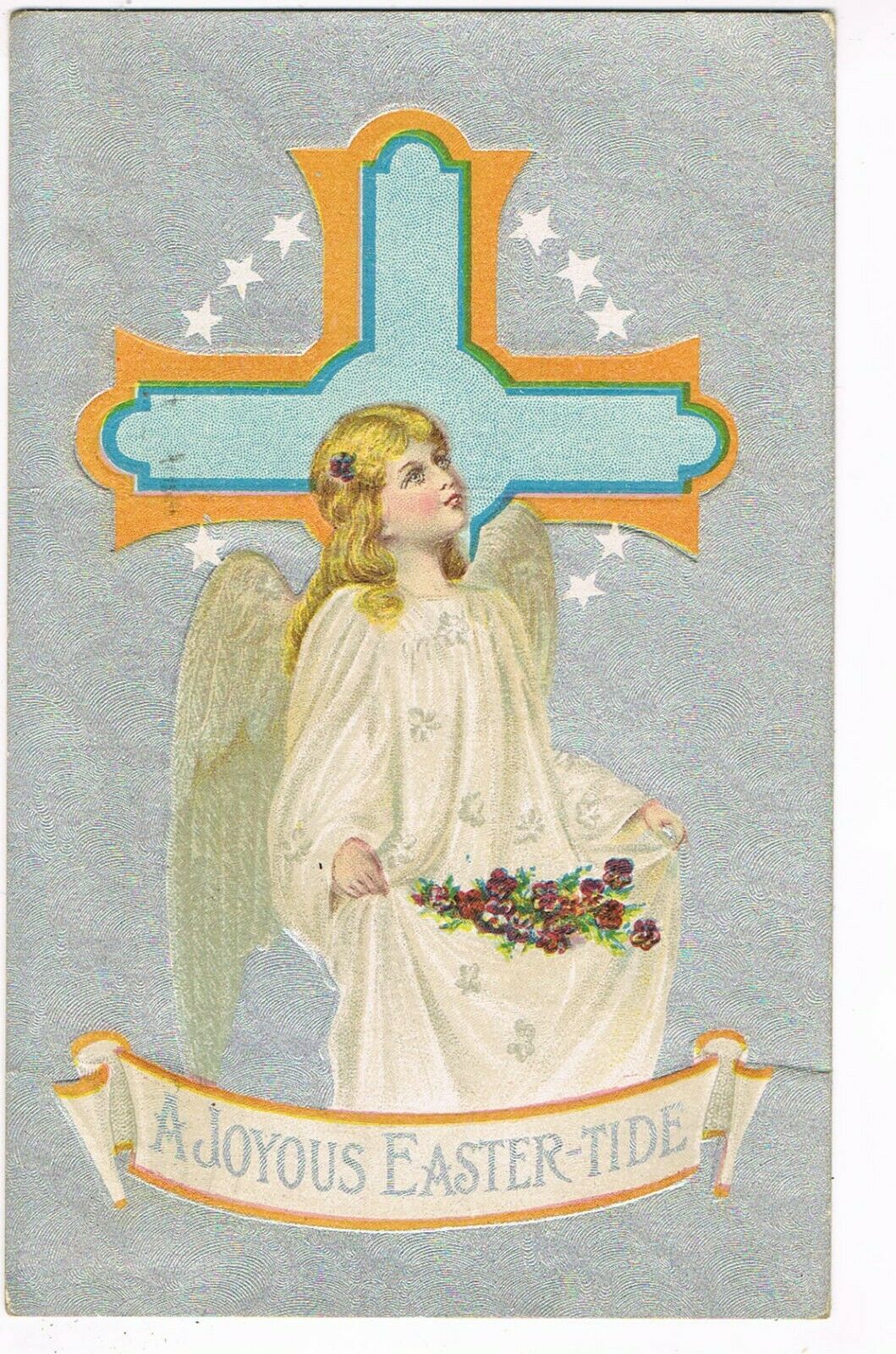ANTIQUE EASTER Postcard ANGEL HOLDING ROSES IN HER WHITE GOWN, CROSS, STARS