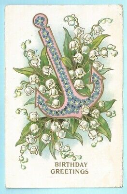 Vintage Birthday Greetings Postcard, Lily of the Valley, Blue Flowers (b418)