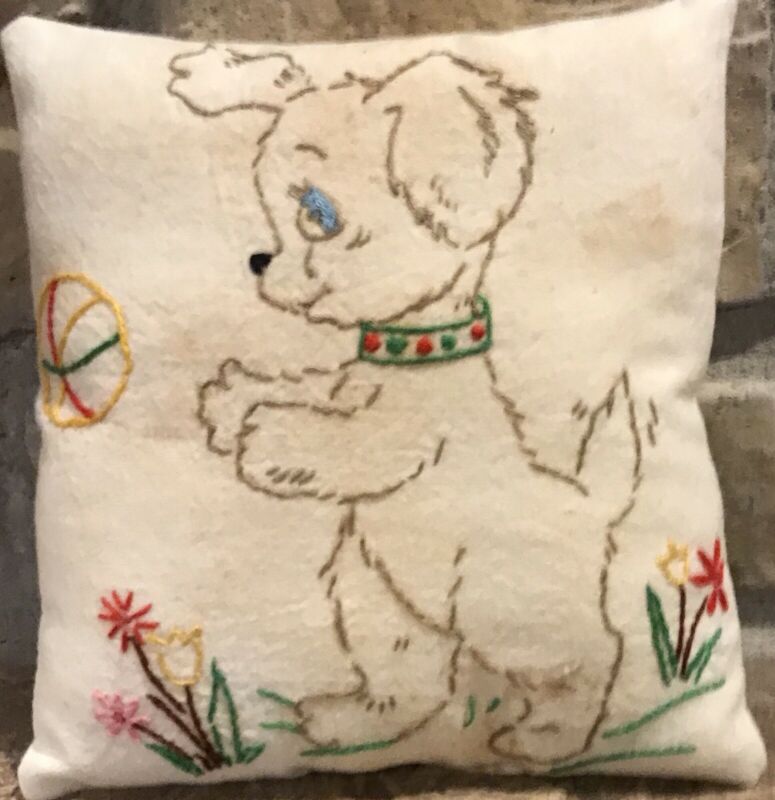 Primitive Made "Puppy Playing Ball" Embroidered Shelf Pillow