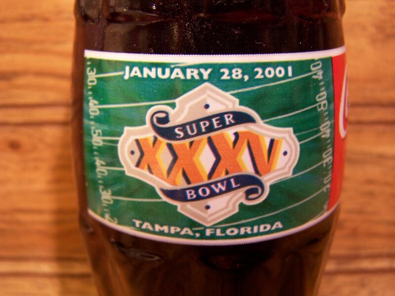 Title (ebay affiliate link): SUPER BOWL XXXV JANUARY 28, 2001 TAMPA FLORIDA, 1 - 8 Oz Coke Bottle