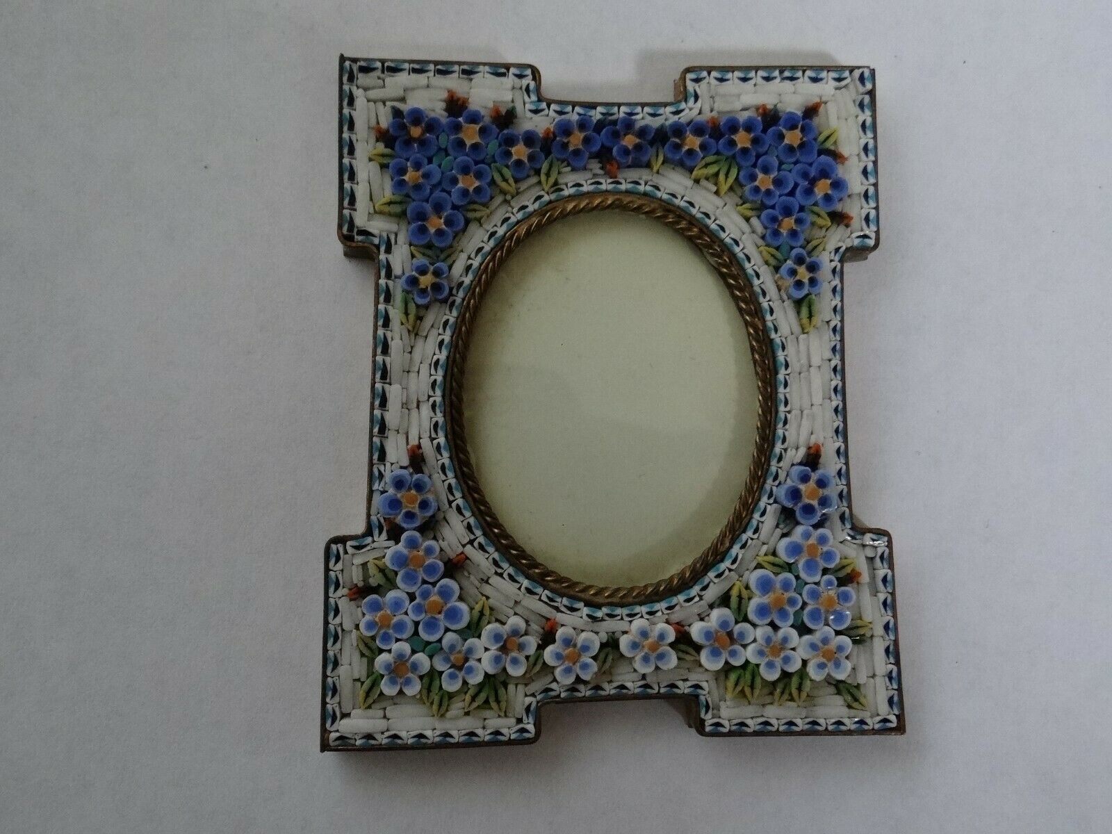 | Very Fine Vintage Micro Mosaic On Brass Blue Flowers Picture Frame |