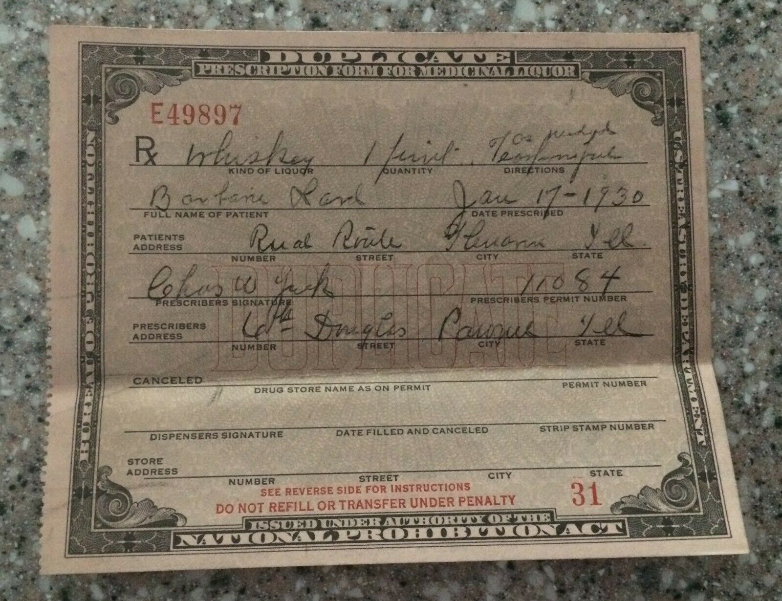 Title (ebay affiliate link): 1930 Doctor''s Prescription Medicinal Liquor "Whiskey" *Prohibition* Illinois