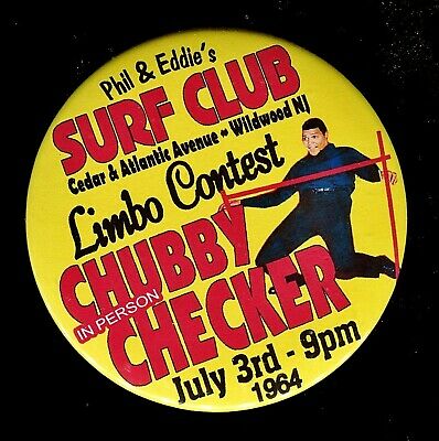 Title (ebay affiliate link): CHUBBY CHECKER 1964 SURF CLUB Limbo Contest 3" Pin back Button THouse 2015