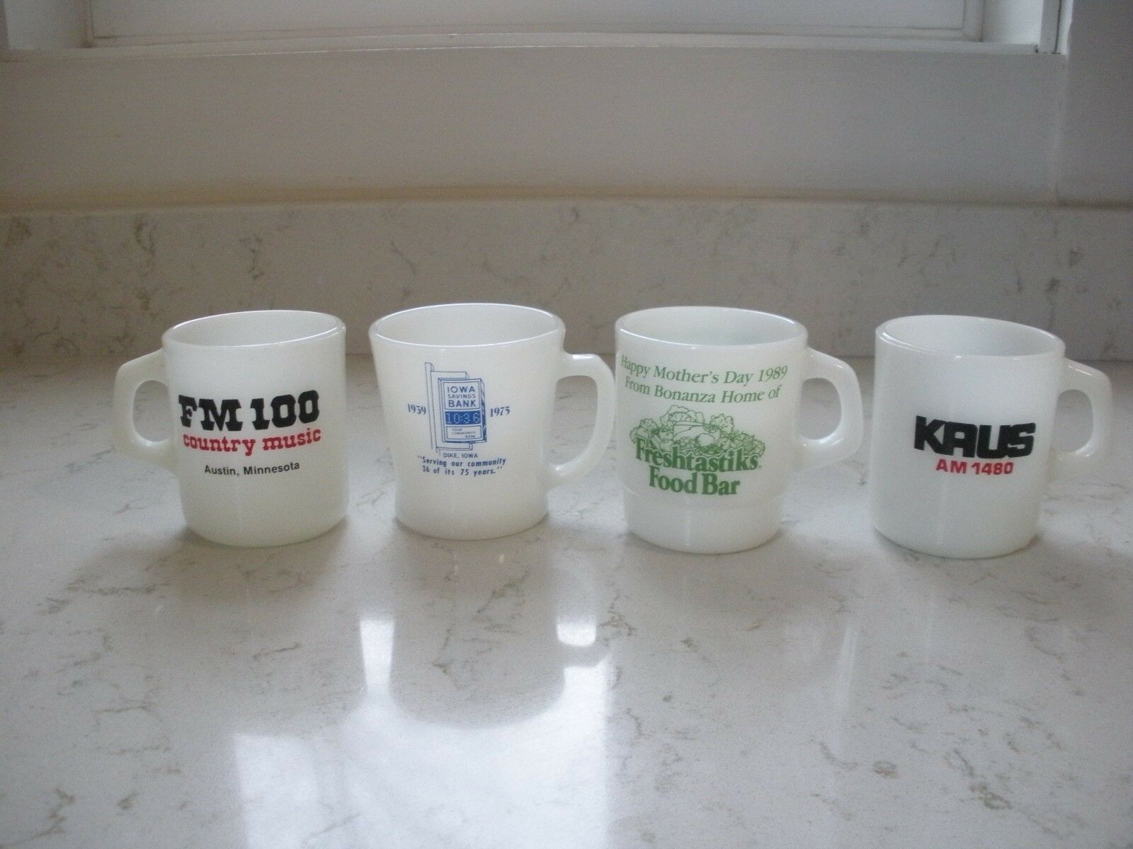 4 vintage milk glass advertising mugs Iowa Sav., Bank Dike, IA. FM 100 ,Bonanza