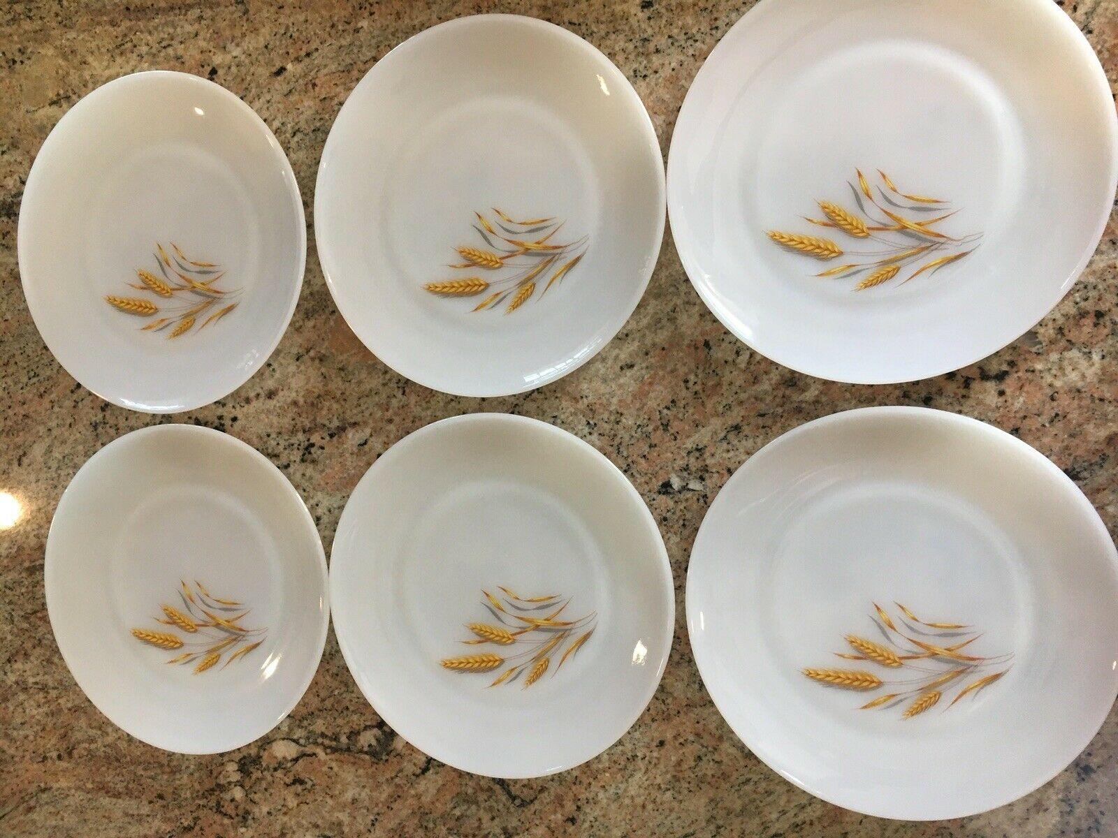 Six Fire King Oven Ware Vintage Milk Glass Wheat Pattern Plates Anchor Hocking