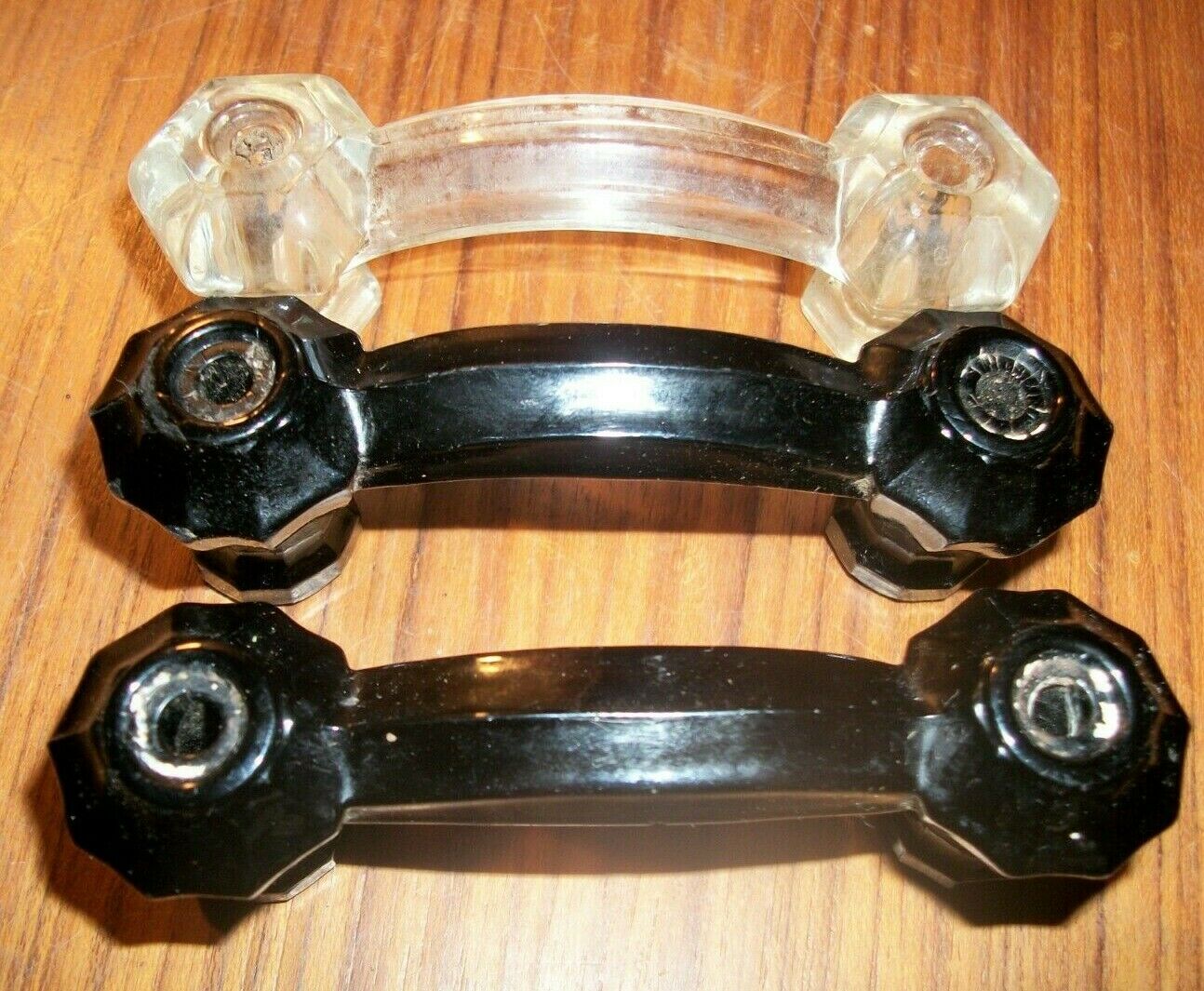 VTG DEPRESSION ERA BLACK MILK GLASS DRAWER PULL HANDLES - ONE CLEAR GLASS