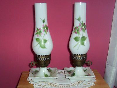 Title (ebay affiliate link): VINTAGE PAIR HANDPAINTED MILK GLASS LAMPS CHIMNEYS