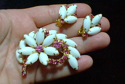 VINT. JULIANA? MILK GLASS w/ PINK BROOCH & EARRING SET!