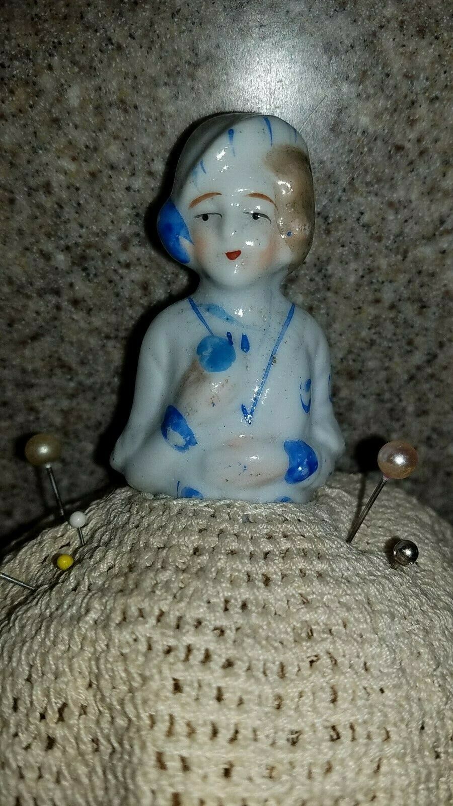 Title (ebay affiliate link): Vintage Porcelain Half Doll Pin Cushion - Blonde Woman in Blue & White with Hat