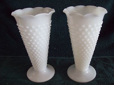 White Milk Glass Vases-Hobnail Design-9 1/2" Tall