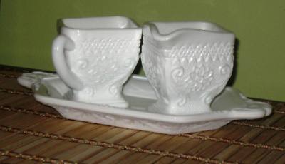 White MILK GLASS Sugar, Creamer + Tray SANDWICH PATTERN