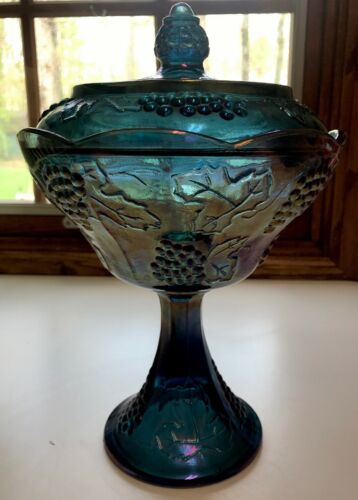 Title (ebay affiliate link): Blue Carnival Glass Pedestal Candy Dish Grape Pattern Iridescent Purple