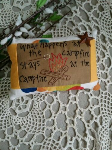 Title (ebay affiliate link): Primitive stitchery Sampler What Happens Stays Campfire Summer Pillow Nature