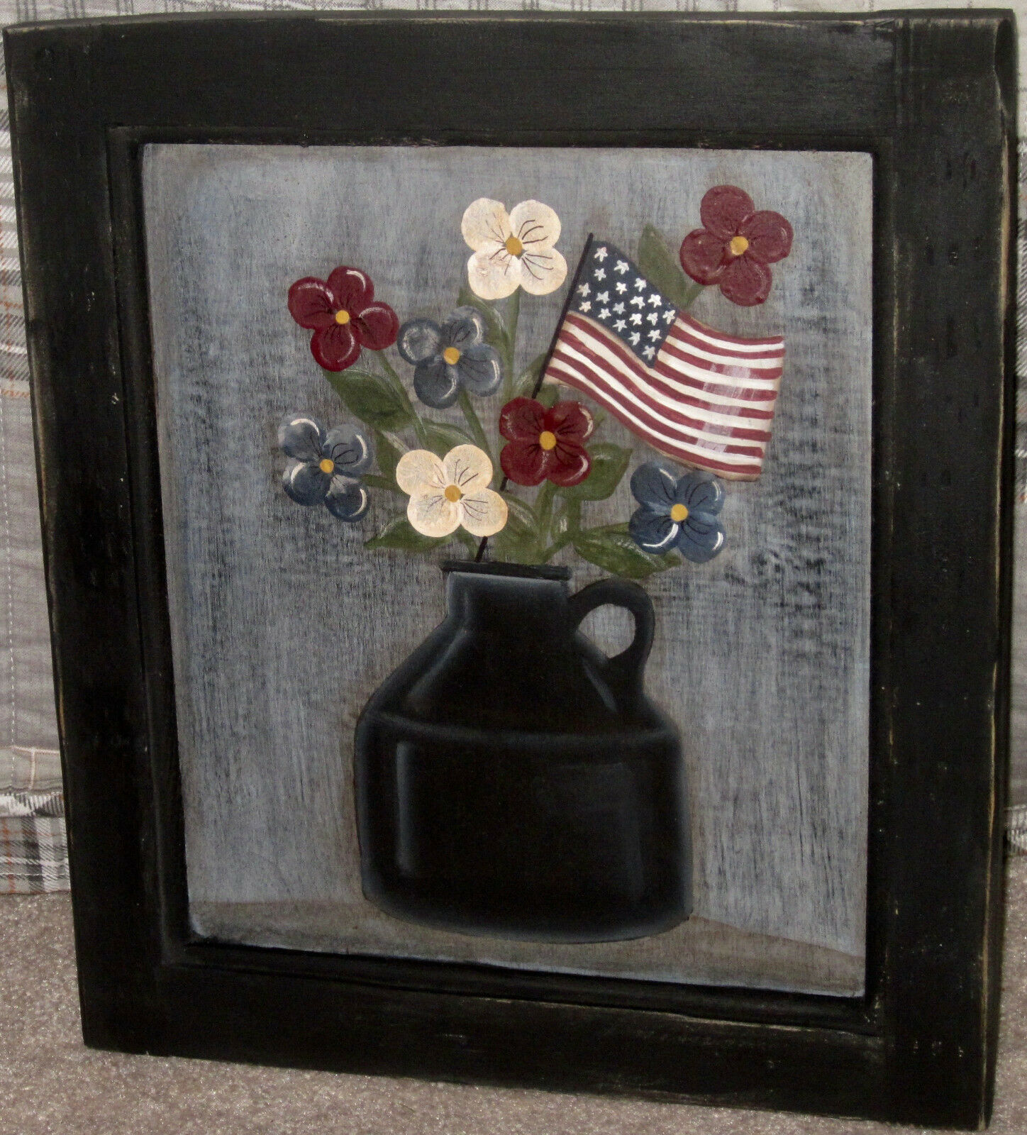 *~*PRIMITIVE*~* HP FOLK ART PRIM JUG/CROCK *~* FLAG *~* AMERICANA *~* DOOR PANEL