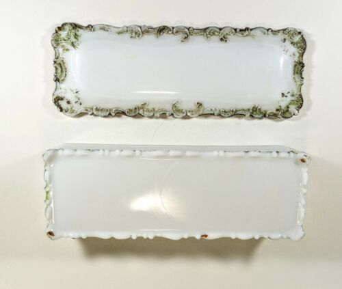 Antique Ornate Long Milk Glass Dresser Glove Trinket Box 10" x 3.75" ~ Vintage