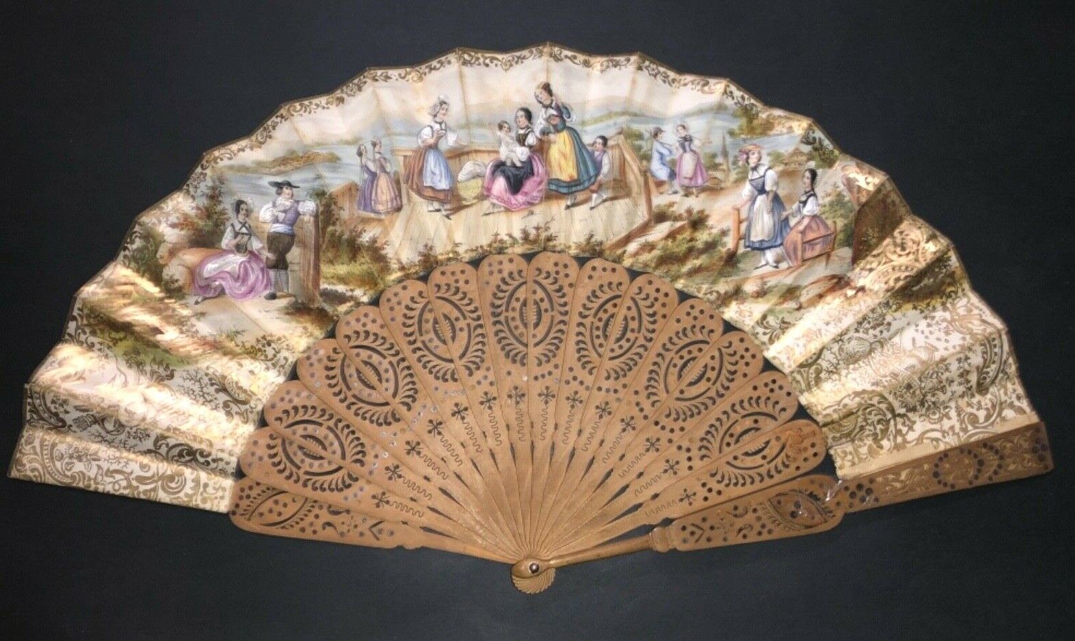 VICTORIAN HAND CARVED WOODEN STEEL INLAY FIGURAL ROCOCO STYLE SCENE FAN