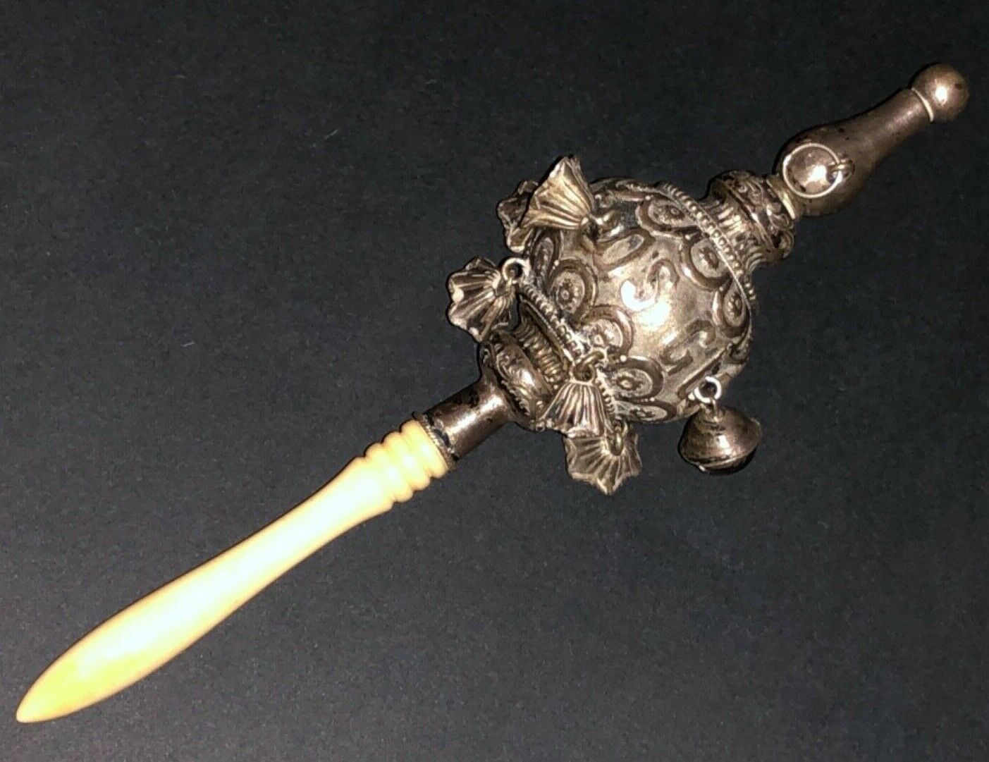 FINE VICTORIAN SOLID SILVER CARVED HANDLE BABLY RATTLE WHISTLE