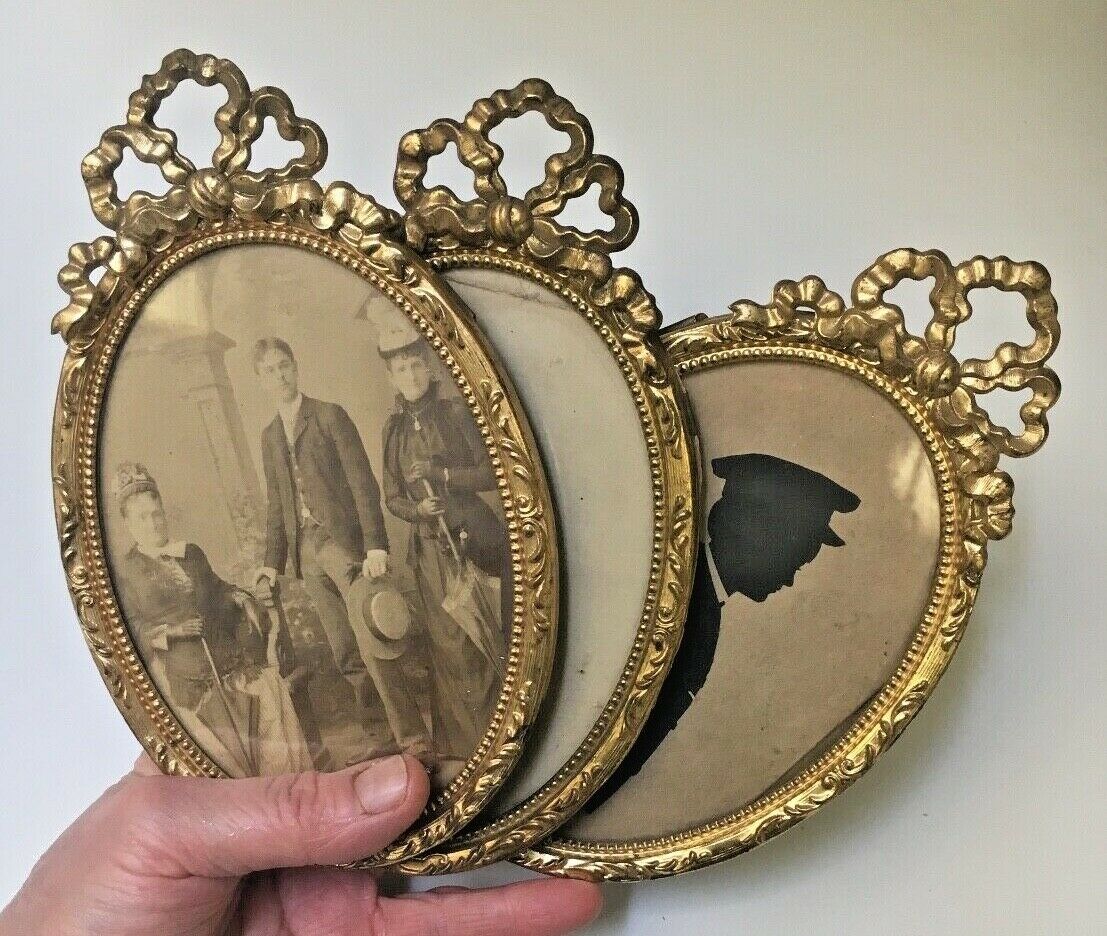 Antique French Lot 3 Oval Brass ornate frames w/Bow mounts~old photo~silhouette