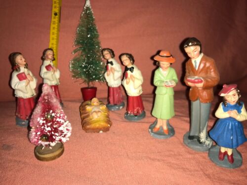 Vtg Xmas Putz Village Figurines and Bottle Brush Trees Choir Family
