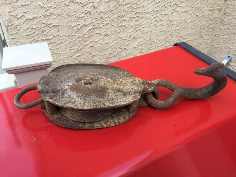 Title (ebay affiliate link): Vintage Cast Iron Metal Pulley Block Tackle Barn Hoist Trolley
