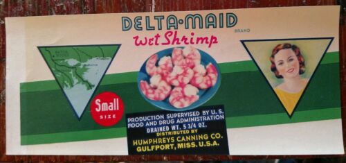 Title (ebay affiliate link): DELTA-MAID brand WET SHRIMP HUMPHREYS GULFPORT, Mississippi 1940''s rare