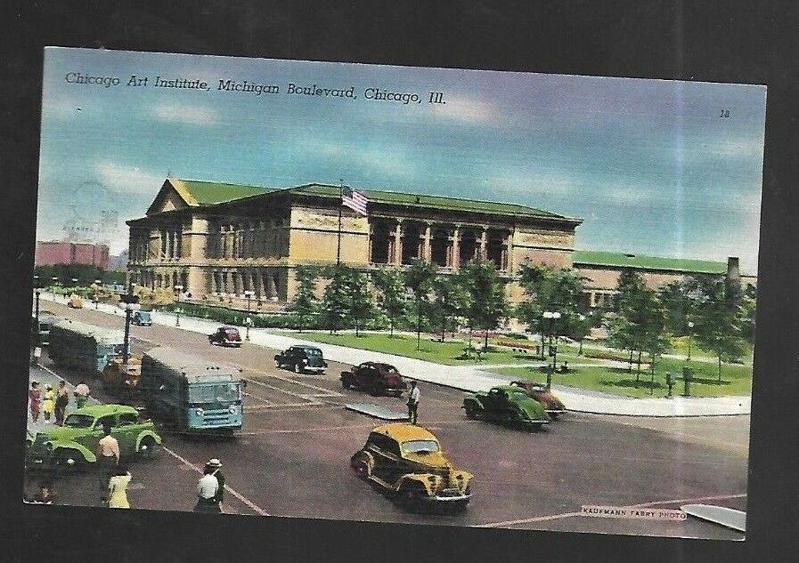 Vintage Postcard Linen Art Institute Michigan Ave Chicago ILLinois Old Bus Cars