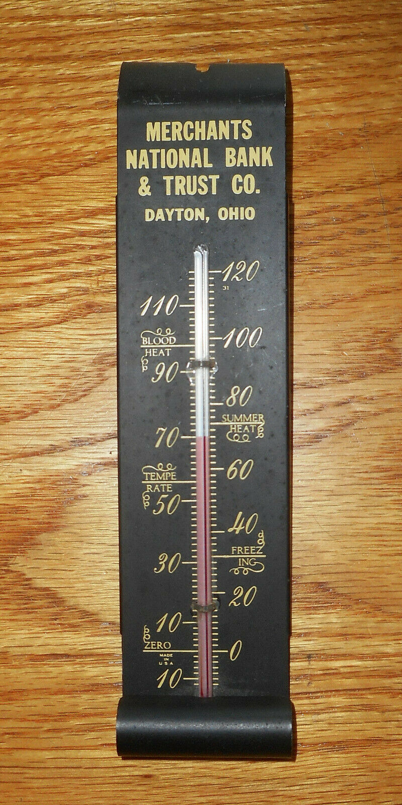 Title (ebay affiliate link): Vintage Metal Merchants National Bank & Trust Dayton Ohio Thermometer Works