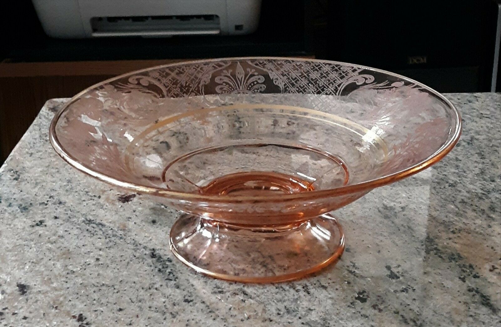 Title (ebay affiliate link): Vintage Floral Etched Pink Depression Glass Footed Bowl Compote