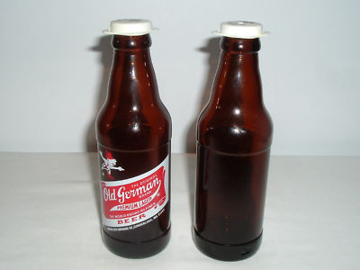 2 Old German Premium Lager Bottles, Shaker Tops, Empty