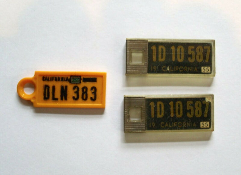 3 Vintage License Plate Key Chain Tags -- 1 CA 1962, 2 matched CA 1955