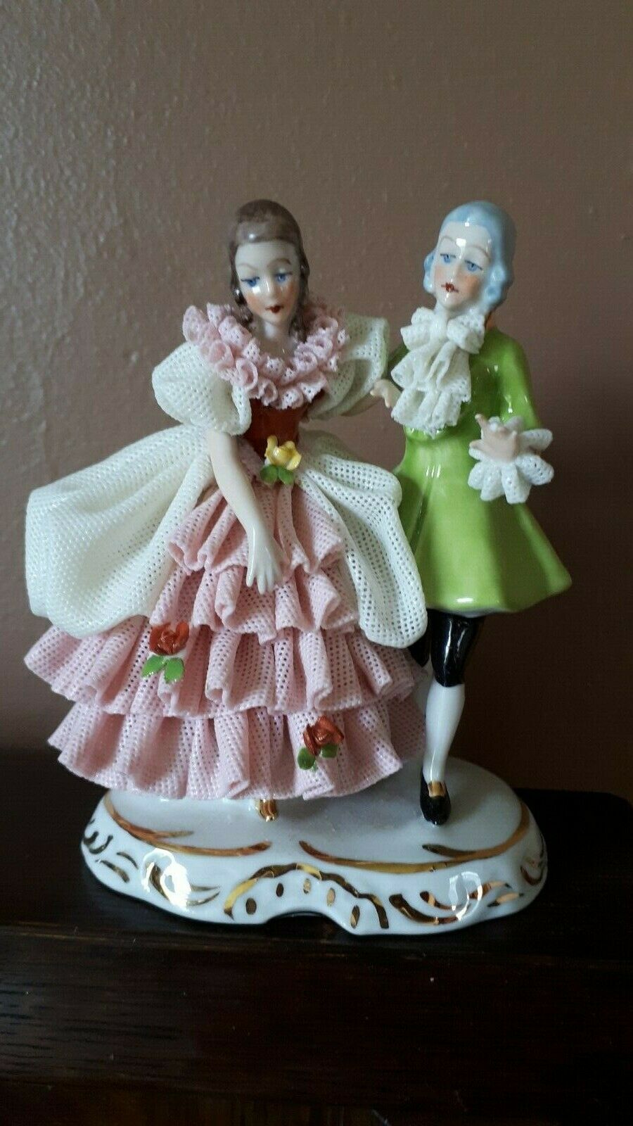 DRESDEN GERMANY COUPLE FIGURINE DAINTY LACE PORCELAIN